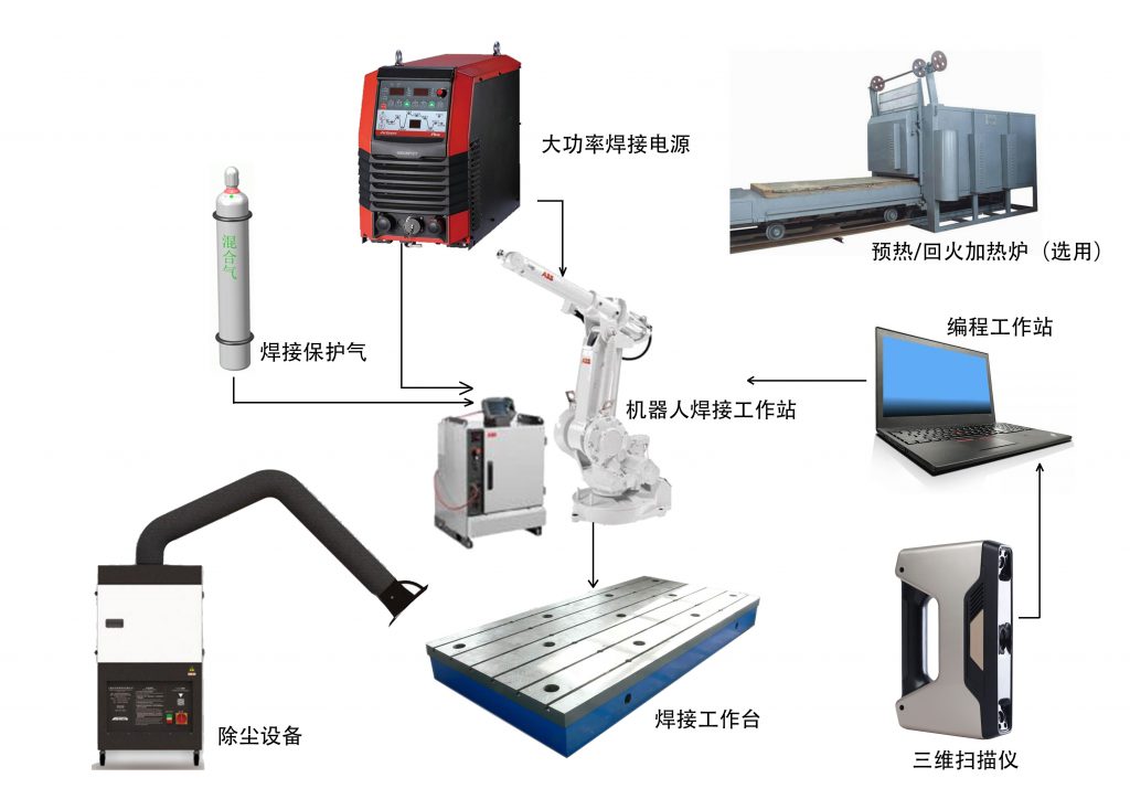 3D增材系统一般由工业机器人系统、三维扫描仪、焊接电源和送丝机构、机器人水冷焊枪、冷却水循环系统、自动清枪剪丝器、吸尘排烟系统、离线编程软件等组成。